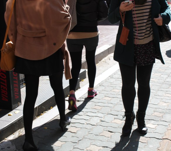 40F (5°C) in Seoul feels like 32 (0°C) in Bloomington, IN. In this 30 or 40 degree weather, I shiver in jeans. Looking around, my Korean counterparts are chic in very short dresses or shorts, and stockings. I bow down to them.