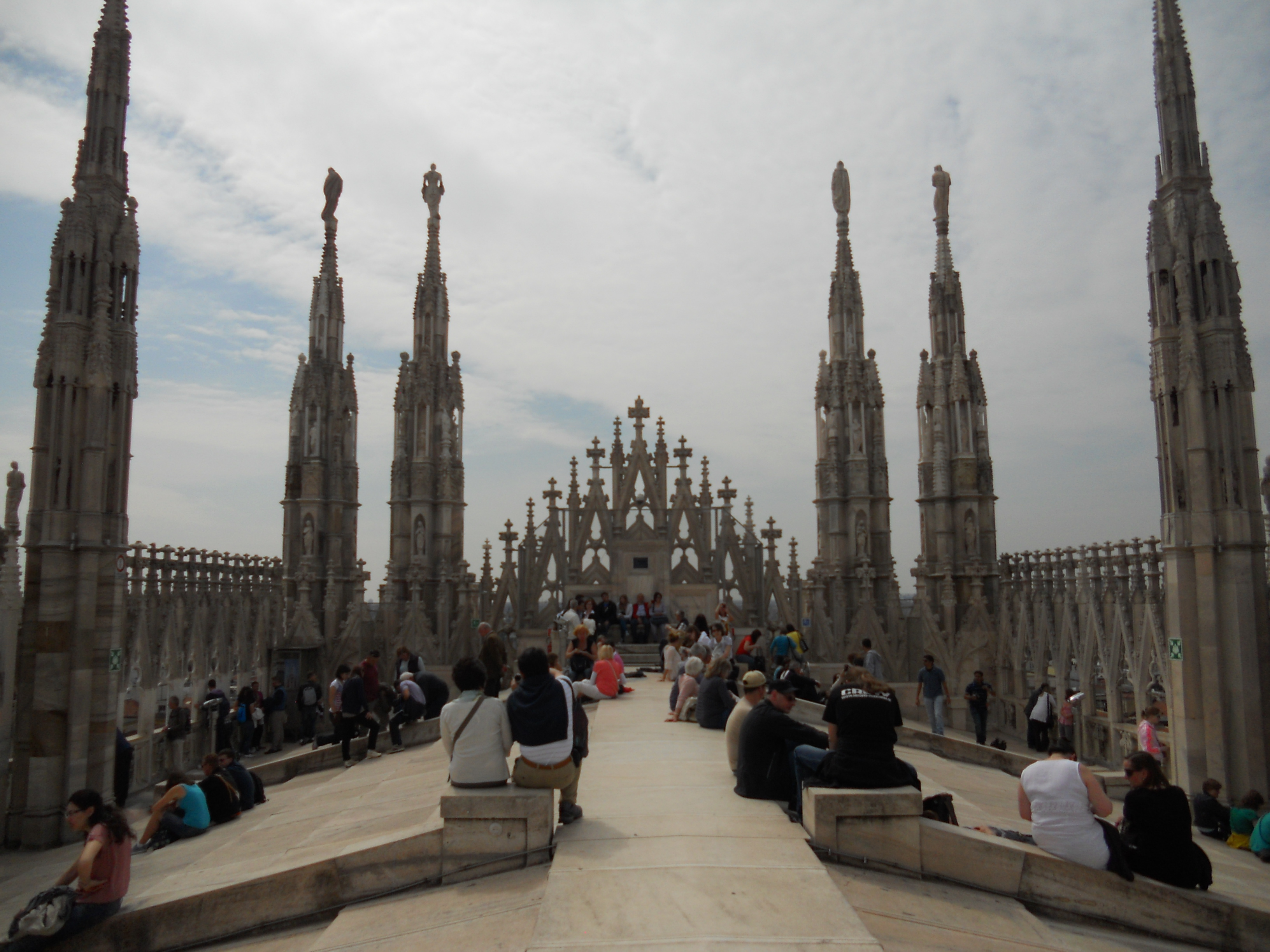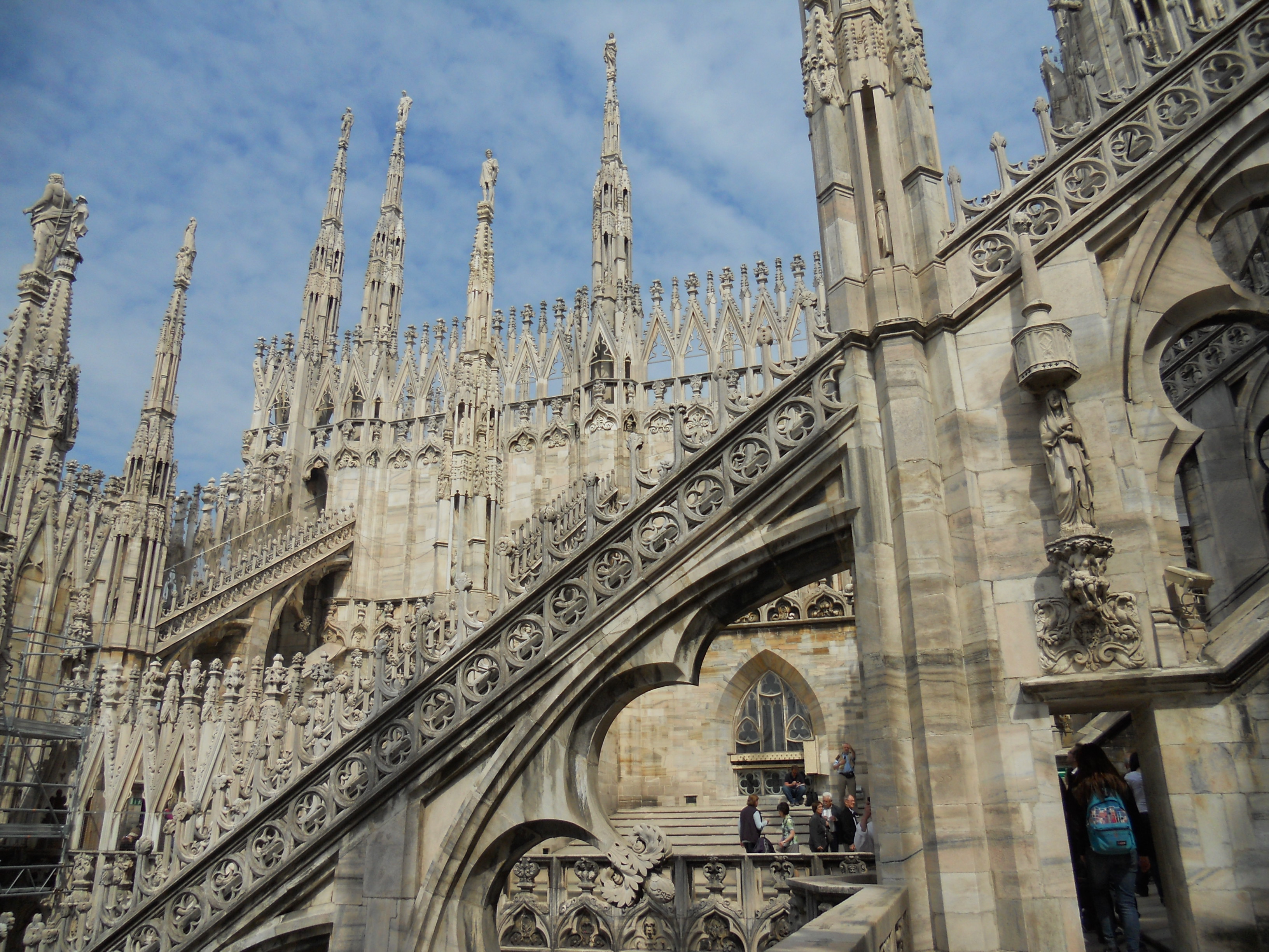 Xem Nhà Thờ Milan phải leo lên mái mới thấy hết được sự kỳ diệu của kiến trúc này. Từ khi bắt đầu leo lên các bậc thang, người ta đã sửng sốt và kinh ngạc vì các chi tiết kiến trúc độc đáo của nó: 135 tháp hình chóp thật nhọn và thật cao nằm trên các trụ chống tường nằm ngang (flying buttress) và vô số các chi tiết điêu khắc bao trùm không gian của những tháp và trụ và hoa văn này. Tháp chính cao nhất là 109 mét. Trên đỉnh mỗi tháp hình chóp là một bức tượng điêu khắc to bằng người thật, nhưng nhìn từ dưới hoặc từ xa thì chúng giống như những búp bê đồ chơi, vì nhà thờ quá là cao và to. Ngoài ra tượng điêu khắc thì ở khắp mọi ngóc ngách, tổng cộng hơn ba ngàn bức.