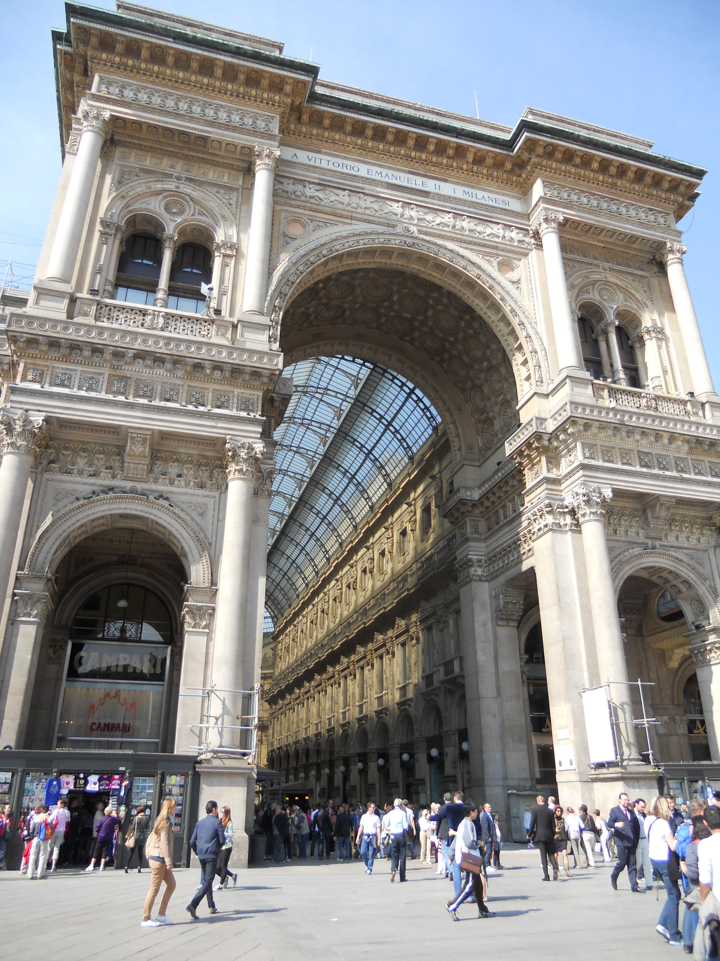 Trước khi thấy nhà thờ thì đi ngang Galleria Vittorio Emanuele II. Galleria là khu mua sắm giống như siêu thị nhưng thường là có mái vòm che bằng kính. Ở Galleria Vittorio Emanuele II có nhiều cửa hàng bán đồ đắc tiền, các khách sạn nhiều sao, nhà hàng và một tiệm McDonald. Thiết kế của Galleria đẹp, vừa mang tính hiện đại vừa cổ điển, sàn lát đá nhiều màu và vòm trần bằng kính bắt mắt.