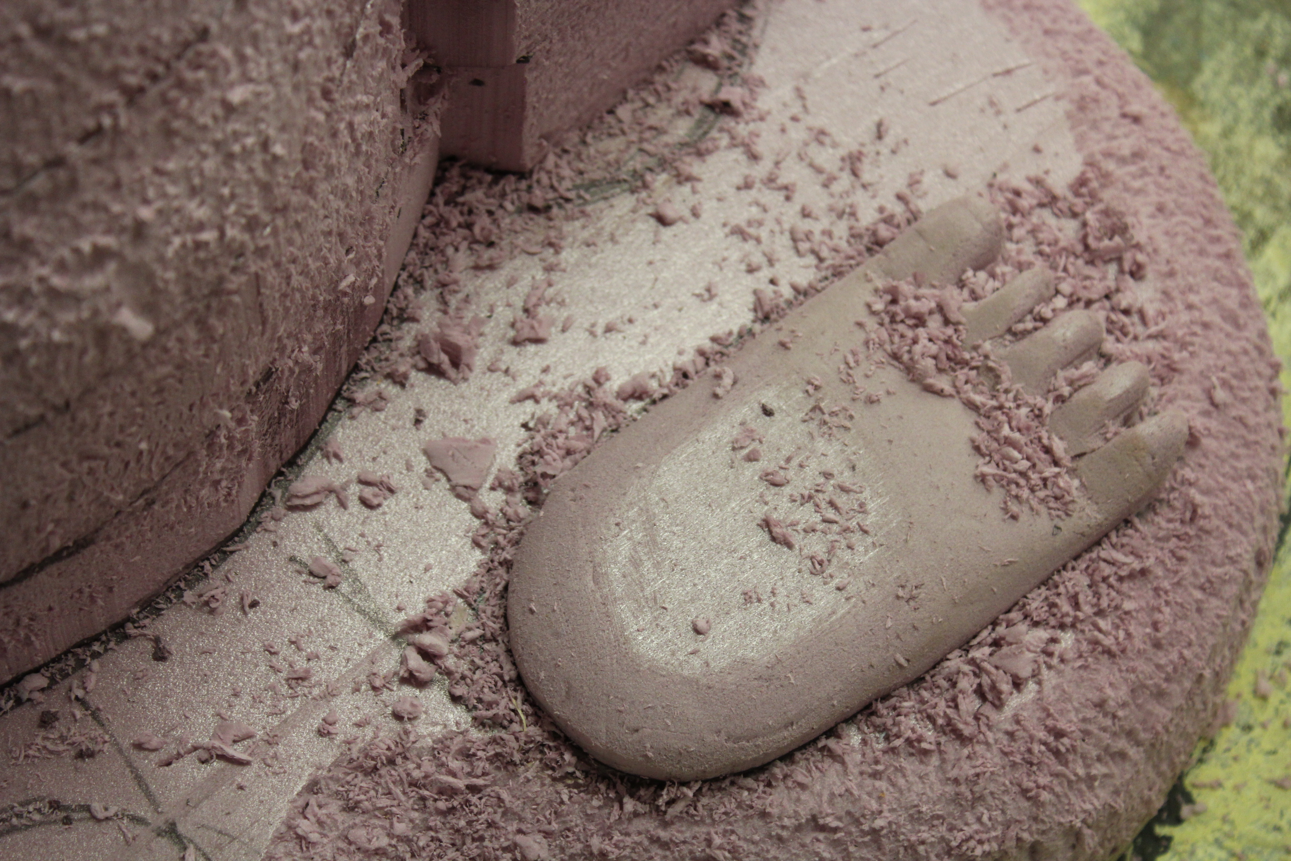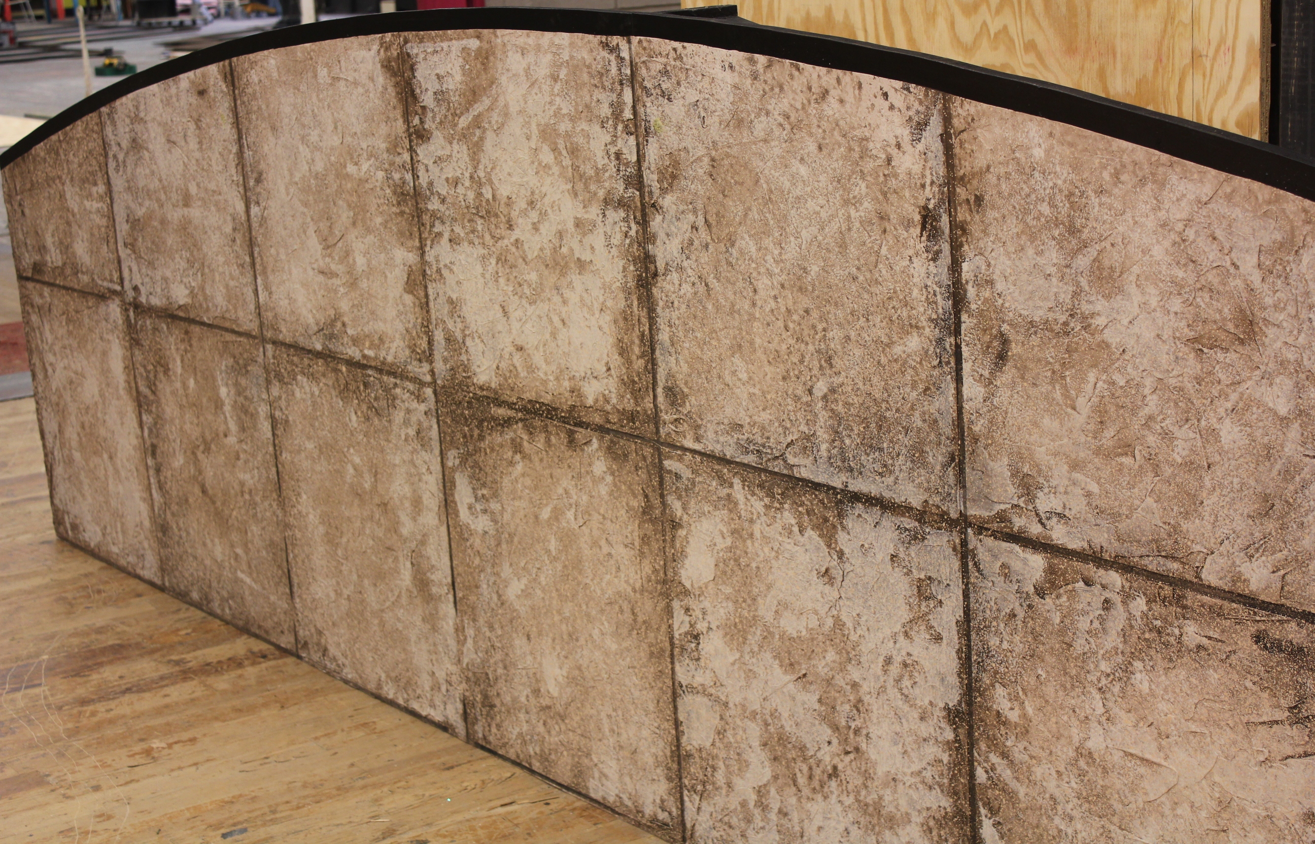 Then, the wall is transferred to the Paint and Props Shop. There, pieces of foam in different shapes and sizes are cut and laid on the surface: