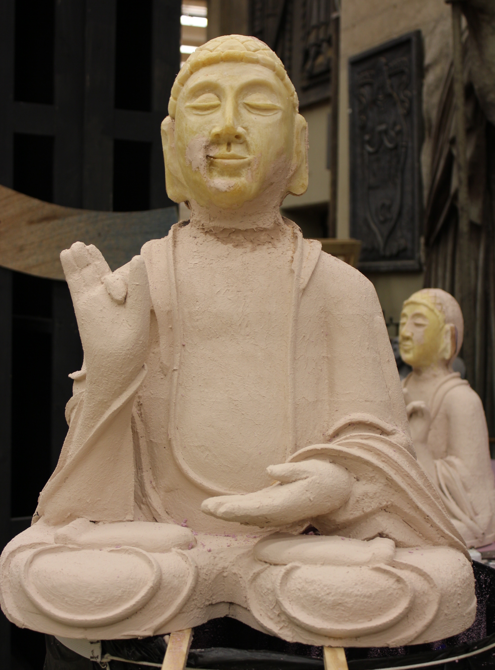 To create the faces of the statues, Mark Smith, Director of Paint and Props Shop who is also in charge of creating these statues, sculpted the face from clay first. Then he made a mold of it that he could use to cast three faces for the statues: