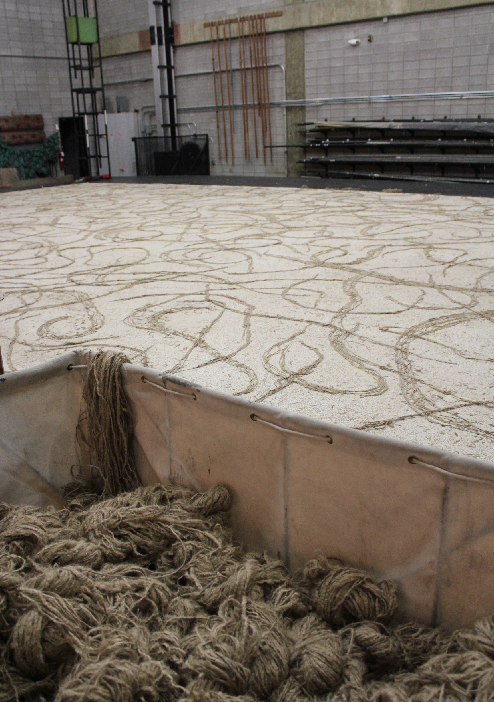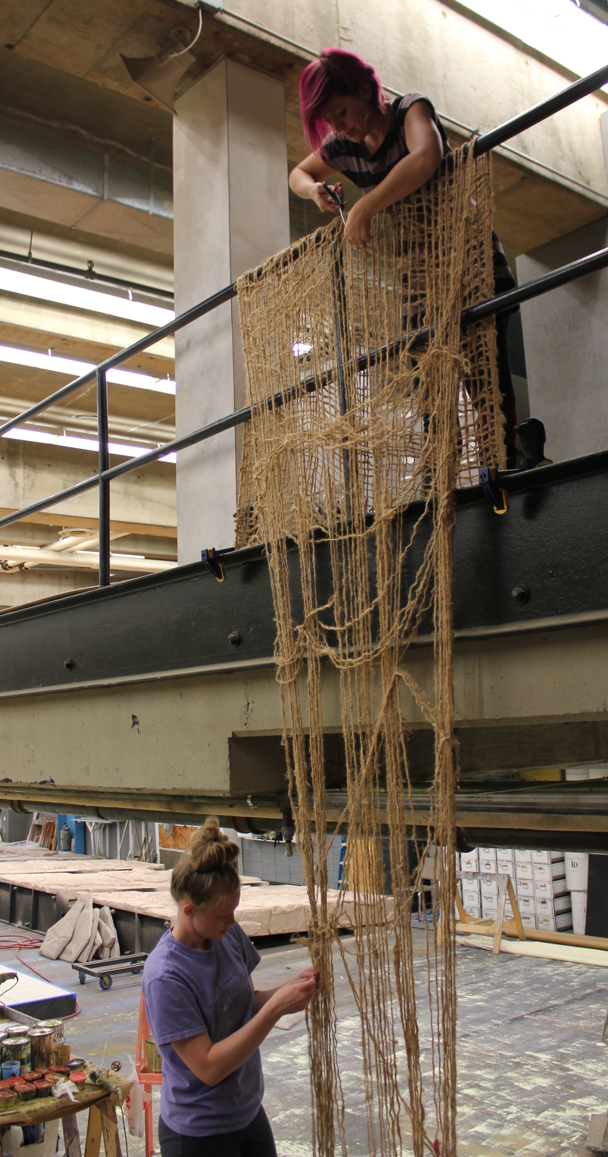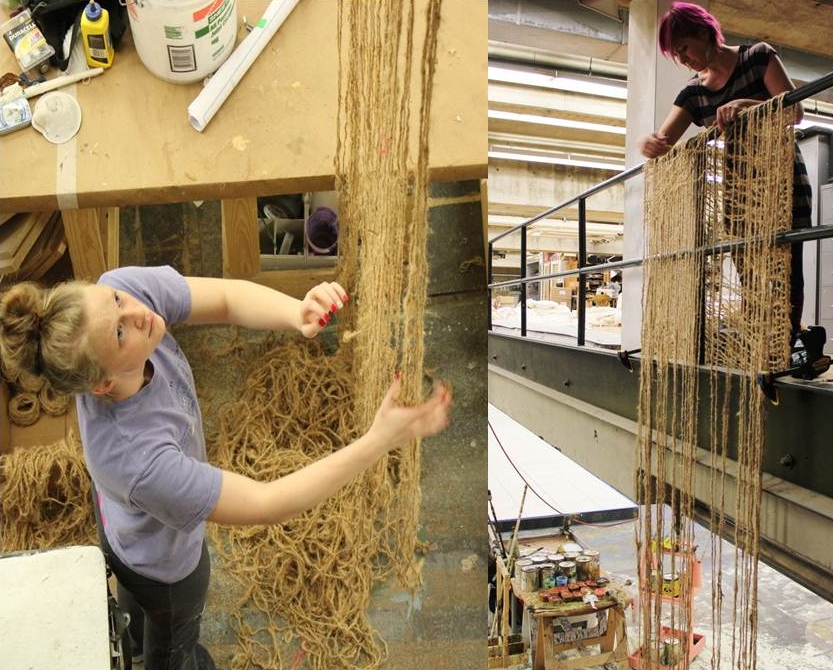 Lynne Glyck (chemistry major) and Gwen Law (Scenic Painting and Properties Assistant) who is in charge of creating this drop are painstakingly separating and pulling the threads:
