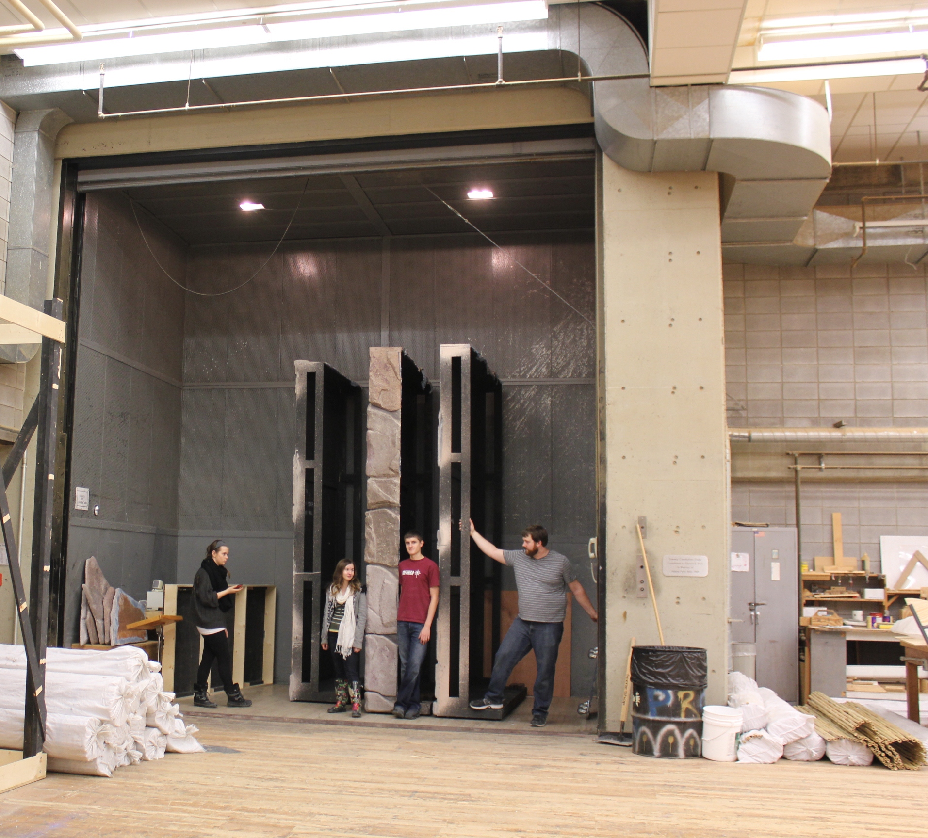 It is the finished wall in pieces being transported downstairs to the stage. They are at least double the height of the students. They are all inside a huge space which is the elevator, one that is specially built to move gigantic objects and goes very slowly, three times slower than a regular one.