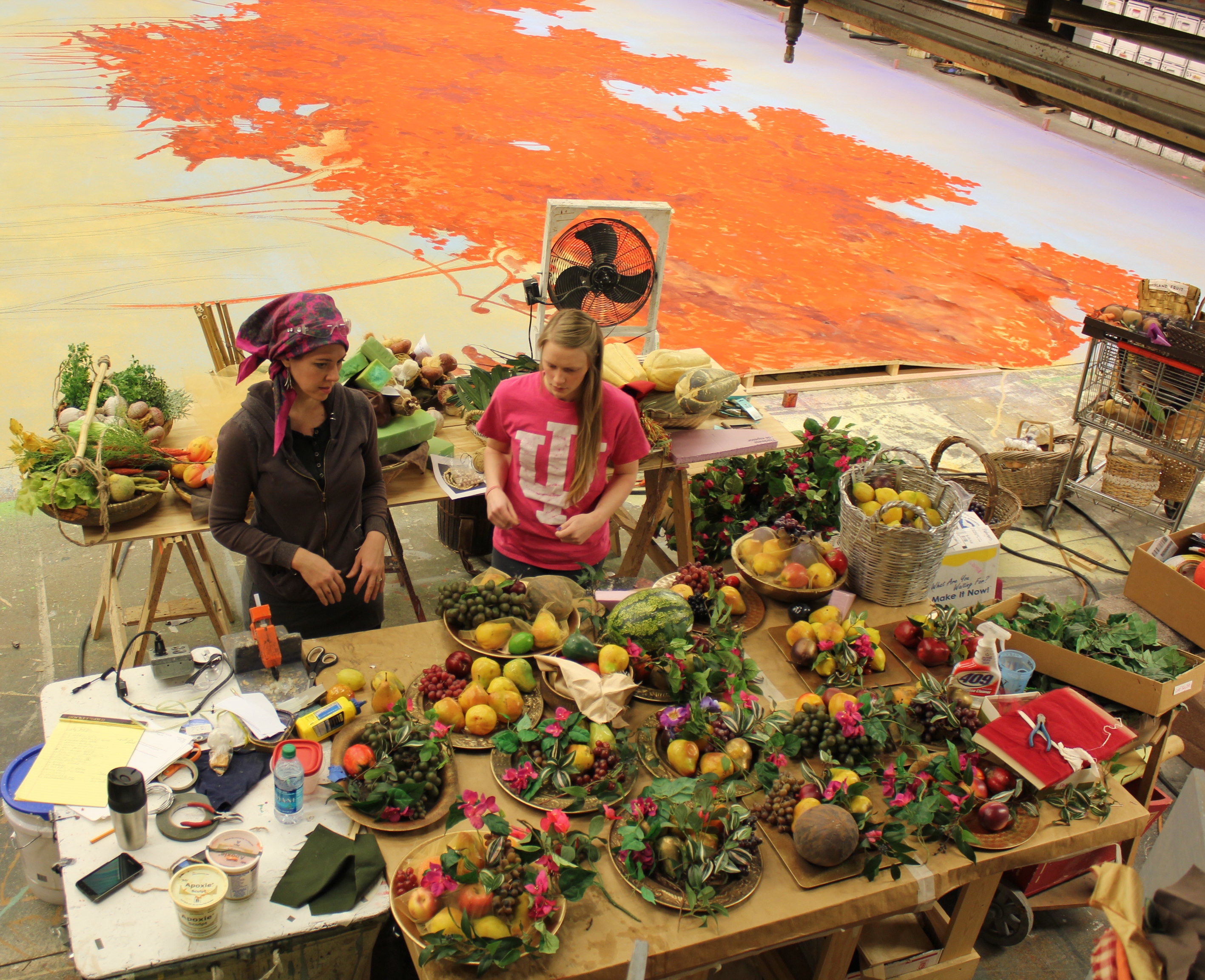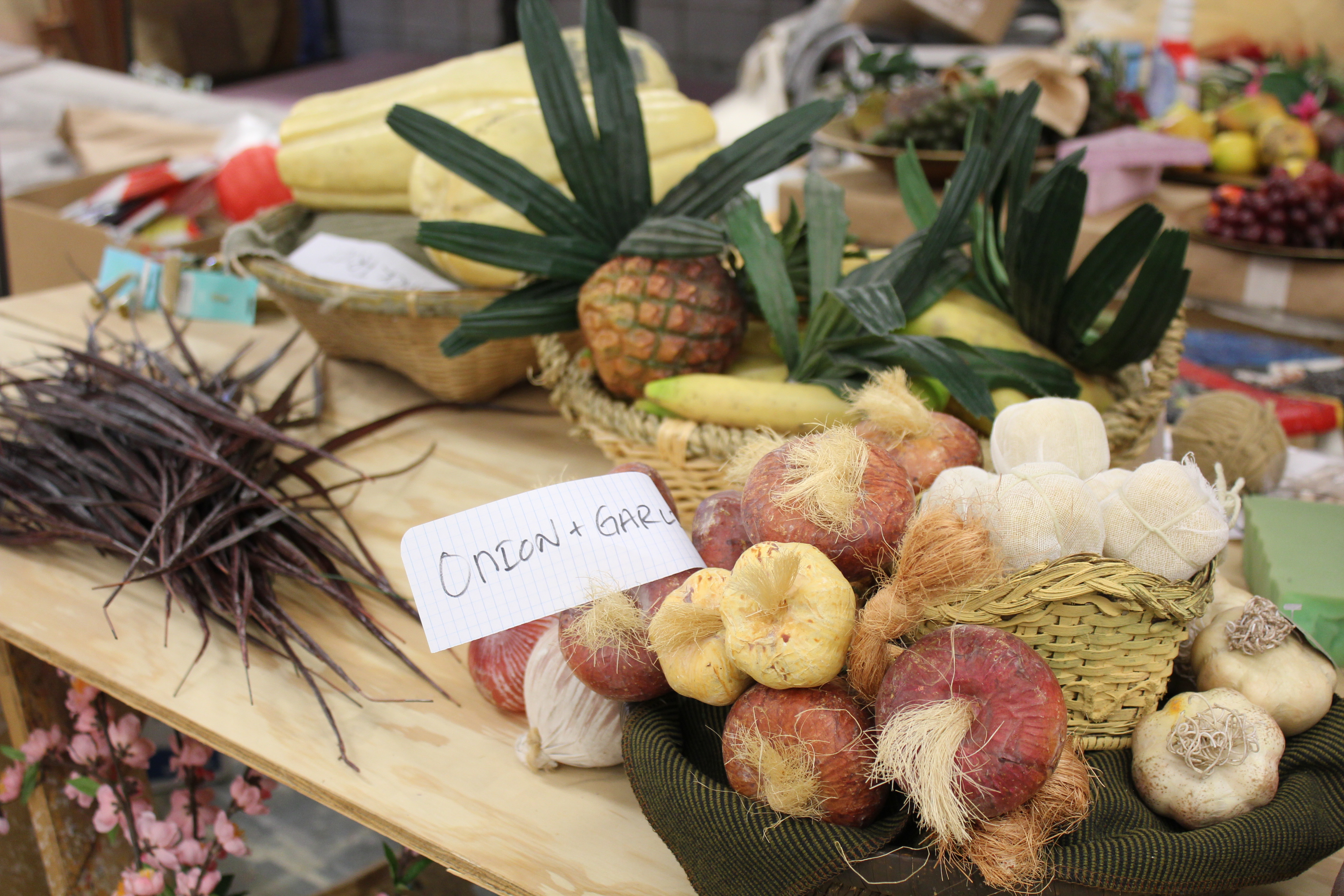Hàng trăm món đồ và nhiều thứ vật liệu được dùng để làm hơn 50 món đồ dùng sân khấu như mâm quả, rau trái ở chợ.