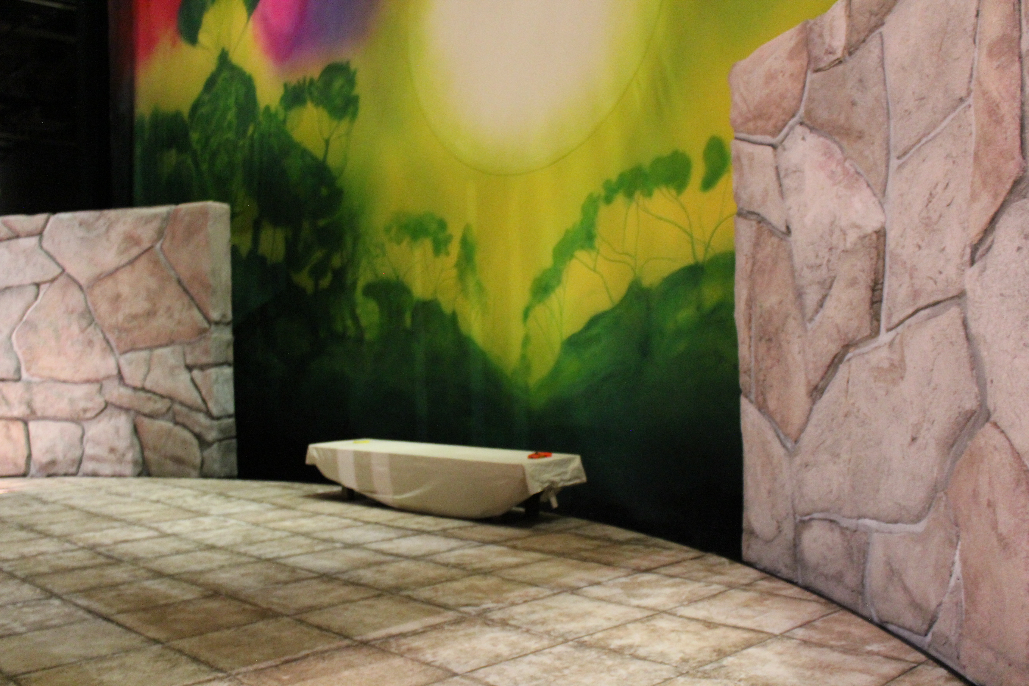 9 tấm phông, 5 tấm có kích thước 12m x 15m hoặc 15m x 18m được làm tại xưởng sơn: 2 tấm sợi nhám, 1 tấm mùa thu, 1 tấm mùa xuân, 1 tấm vàng (gold), 1 tấm vàng (yellow), 1 tấm mây vàng, 1 tấm Niết Bàn.