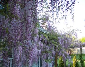 Hình bên là dàn wisteria sau vườn. Nó nở hoa đẹp như mơ. Mỗi năm tôi phải tỉa nó ít nhất hai lần. Mỗi lần gom đầy một xe tải cành, lá. Chả là wisteria rất mạnh, càng tỉa nó càng mạnh. Đến nỗi rễ cây đâm lên khắp vườn sau và lan qua vườn hàng xóm. Cuối cũng tôi phải chặt nó vì rễ nó quá mạnh làm chết nhiều cây khác trong vườn. Sau khi chặt, mười năm liên tục phải xịt thuốc giết rễ mà năm nào nó cũng lên lại!